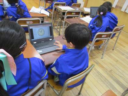 クロームブックを使って「なんじなんぷん」の学習をしました。短い針と長い針が示す数字に気を付けながら、時計が示す時刻を正しく読んでいきました。