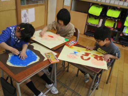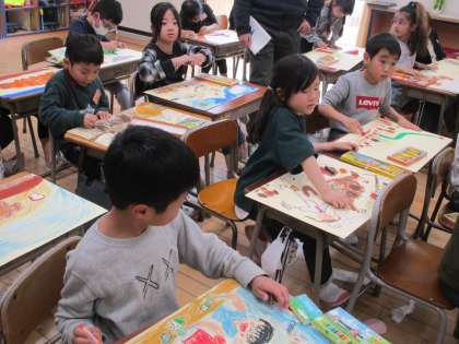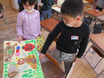 図画工作科では「おはなしからうまれたよ」の学習をしました。自分の好きなお話を読み、思い浮かべたことを絵で表現しました。完成した作品を鑑賞し、友達が思い浮かべたことを聴いたり、作品のよさを伝えたりました。