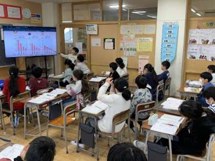 算数科の学習で、一目盛りの大きさと棒グラフの読み取りやすさの関係について考えました。子供たちは、読み取りやすいと考えた理由を友達に伝えたり聞いたりしながら、進んで学習に取り組みました。