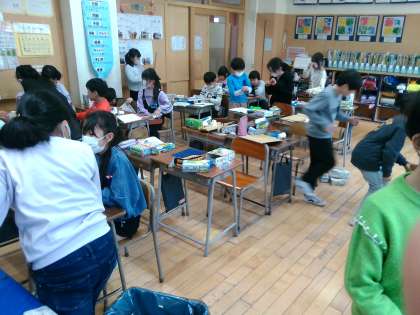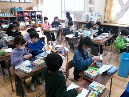今日は、一年間の理科の学習を生かしておもちゃづくりをしました。子供たちは、世界に一つだけの「理科おもちゃ」の完成を目指して、設計図をかいたり、作って試してみたりしながら楽しく学習に取り組みました。