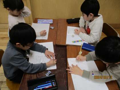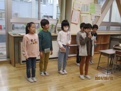学期末の学年集会に向けて準備をしています。自分たちでせりふを考えたり、練習をしたりしています。