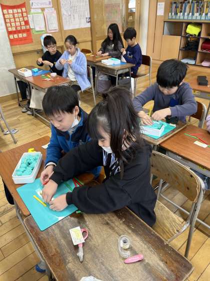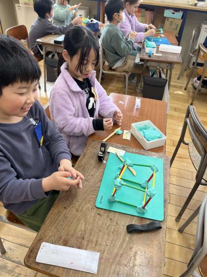 算数科では、箱の形について学習しました。この日は、棒と粘土を使い、はこの形をつくることで、「へん」「ちょう点」「面」という言葉への理解を深めました。
