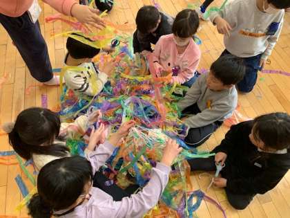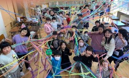図画工作科の学習で、毛糸やすずらんテープで「ひもひもワールド」をつくりました。子供たちは、思い思いに毛糸やすずらんテープを、結ぶ・引っ掛ける・伸ばすなどして楽しみながら学習しました。