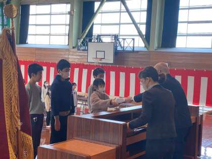 初めに、各学級の代表がステージ上に登壇して、各学級全員の分の修了証を校長先生から受け取りました。