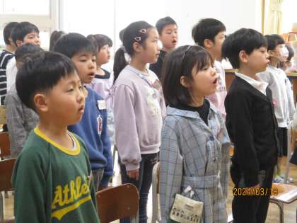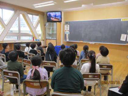 卒業式が行われ、教室で式の様子をオンラインで視聴しながら、お世話になった6年生に感謝の気持ちをもって参加しました。