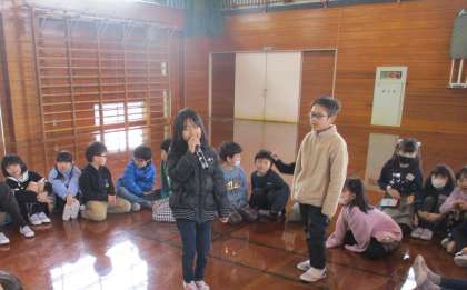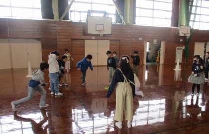 2年生最後の学年集会を行いました。色団ごとに爆弾ゲームをしたり、ドッヂビーをしたりして楽しみました。爆弾が当たった人やドッヂビーで当たった人は、2年生の思い出、3年生で頑張りたいことを学年みんなの前で語りました。