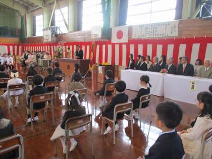 大きなランドセルを背負って登校してきた子供たちは、保護者や来賓、先生、6年生が見守る中で、少し緊張した面持ちで式に臨んでいましたが、担任が読み上げる自分の名前に、元気な声で返事をしていました。