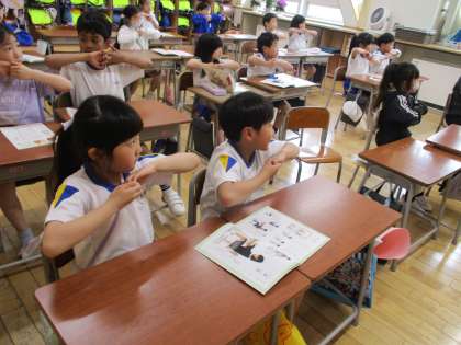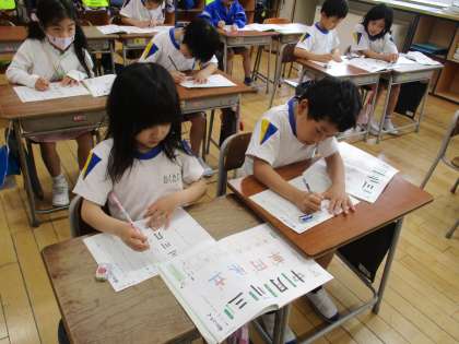 書写の学習は、書写体操から始めています。鉛筆の持ち方、字を書くときの姿勢を確認し、正しく丁寧に書こうと真剣に取り組みました。