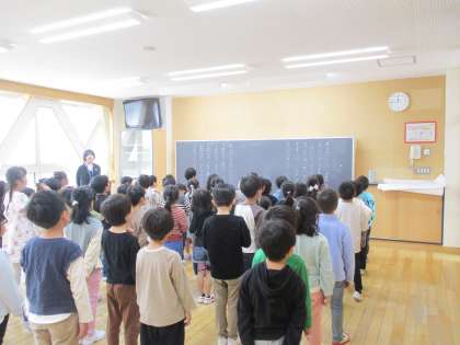 1年生は、奥田小学校の校歌を練習中です。今日は歌詞の一部を隠して歌うことに挑戦しました。