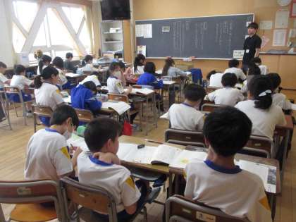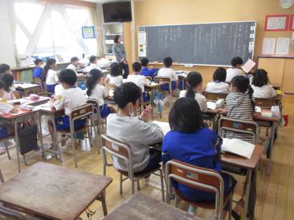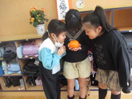 国語科では、あまんきみこさんの作品「白いぼうし」を学習しています。登場する夏みかんの香りをかいだり、登場人物の性格等について話し合って考えをまとめたりしました。