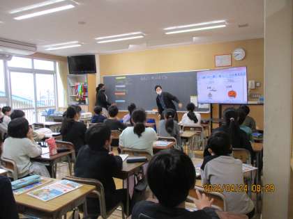 子供たちは、英語を使うことに慣れた様子で、先生に挨拶をしたり、天気の様子等をやりとりしたりしています。よく使う言葉の表記を覚えようとチャレンジする姿も見られました。