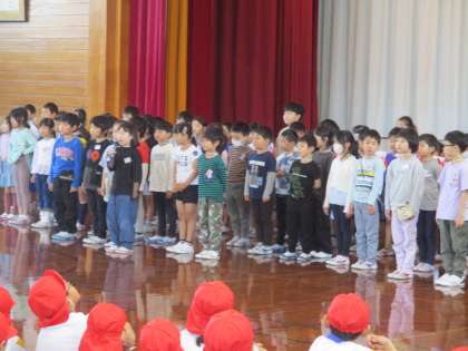 今日は全校の入学お祝い集会がありました。2年生は校歌を1年生にプレゼントしました。集会が終わった後には「1年生におめでとうの気持ちを込めて歌うことができたよ」「これからたくさんのことを1年生に教えてあげたいな」などと振り返っていました。