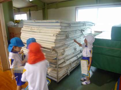 「マットが24枚ぐらいあったよ」「体育館のステージってこんなに広いんだね」等、自分が気になる場所を見て、気付いたことを書いたり、友達と話したりしていました。