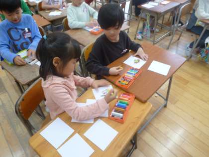 図画工作科の学習で、「好きなもの」をテーマに、食べ物や動物、景色などの6枚の絵を描きました。子供たちは、クレヨンを使って、色を混ぜたり重ねたりしながら、自分の好きなものを思い浮かべて楽しそうに取り組んでいました。