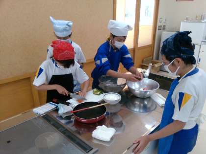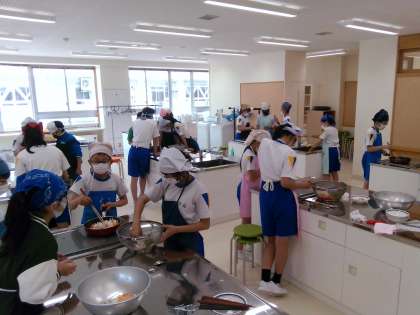 今日は、調理実習を行いました。子供たちは、野菜の切り方や調理の手順を確認しながら、班の友達と協力して野菜炒めをつくりました。