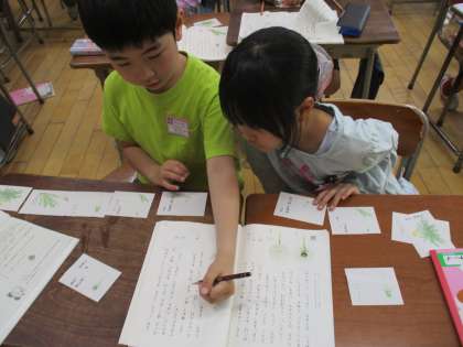 国語科「たんぽぽのちえ」の学習では、順序を表す言葉を見付けて読んだり、絵と文をつないで順序を考えながら読んだりして、内容の大体を捉えていきました。