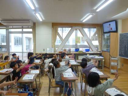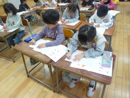書写の学習では、毎授業「しょしゃたいそう」を行い、指や腕をほぐしてから始めています。線の終わりに気を付けながら、お手本をよく見て、丁寧に文字を書く子供たちでした。