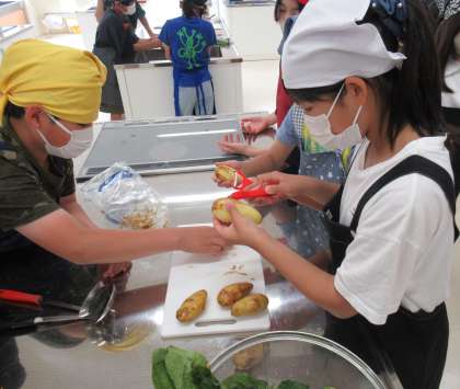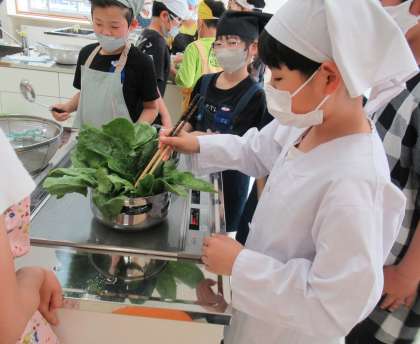 家庭科の学習では、ほうれん草のおひたしと、ゆでいもの調理に挑戦しました。教科書を見ながら何度も手順を確認したり、友達と役割分担をして手際よく準備や片付けに取り組んだりするなど、とても意欲的に活動する子供たちでした。
