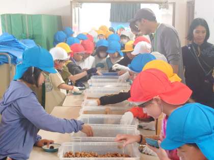 呉羽青少年自然の家の周りでとれる樹の実や葉っぱを選んでいます。