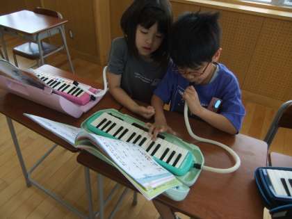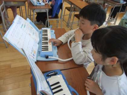 音楽科では「かっこう」の演奏をしています。なめらかな音を出せるよう、息の吹き方を意識して、練習しました。