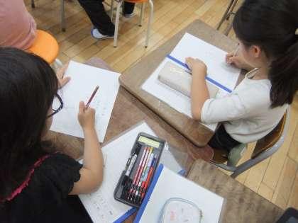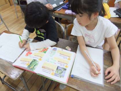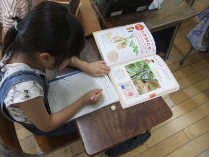 生活科では、野菜の観察カードをかいたり、野菜調べをしたりしています。一人一人が自分の野菜に対して愛着をもち、学習に取り組んでいます。