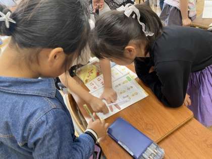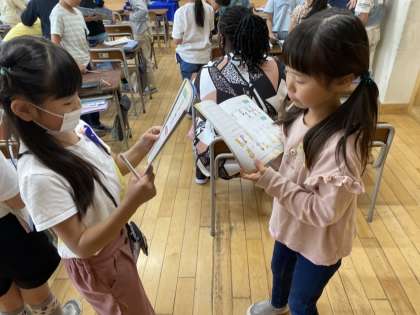 今日の外国語活動では、相手の様子を尋ねる言い方の練習をしました。「How are you?」と友達に声をかけ、「I'm fine」と答えるなど、英語でのやりとりを楽しむ姿が見られました。