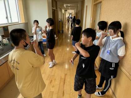 歯についての動画を視聴し、歯肉炎になる原因や歯のみがき方、デンタルフロスの使い方等を学びました。給食後には、学んだことを生かして丁寧に歯をみがく様子が見られました。