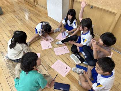 1年生は6月14日(金)に初めての校外学習に出かけます。今日は学年でしおりを読んだり、各クラスに分かれて同じ団の友達と相談しながらそれぞれの役割分担や遊びの内容を考えました。