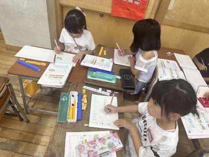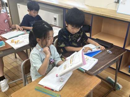 算数科の学習では、ペアの友達と問題を読み合ったり、考えを伝え合ったりしながら、「のこりはいくつ」の学習に取り組んでいます。