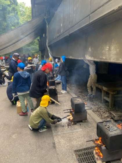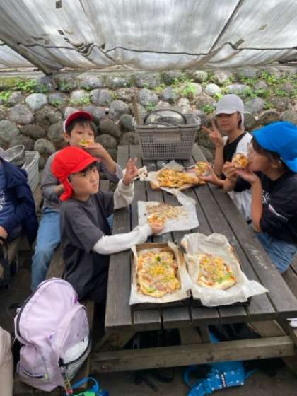 班のメンバーで協力して、おいしいピザが焼け始めました。