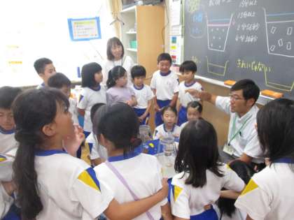 雨水のゆくえについて調べています。粒の大きさの違う砂に着目して実験を行いました。