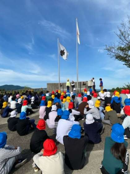 2日目の朝を迎えました。朝の集いを行い、同宿の学校に「自信・前進・好奇心」を大切にしていることを「つなごう明日へ」「令和奥田音頭」を通して紹介しました。