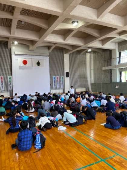 全員、無事に下山しました。 休憩した後に、宿泊学習での学びを振り返っています。