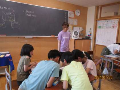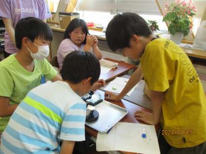 観察実験アシスタントの先生と一緒に、理科の学習を行いました。解剖顕微鏡を使って、メダカの卵を観察しました。子供たちは、拡大して見えた卵の様子に驚いていました。