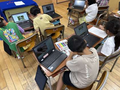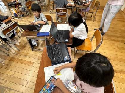 入学して4か月、様々な活動に慣れてきた子供たちは、クロームブックを使った学習にも主体的に取り組んでいます。学校では、アサガオの写真を撮影して、観察日記にまとめたり、手書き入力や音声入力を使用して調べ学習をしたりしています。