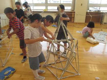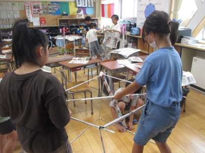 「つなぐんぐん」の学習で、新聞紙を丸めた棒をつないで思い思いの空間をつくりました。協力して、より広く、より高くなるように工夫している様子が見られました。