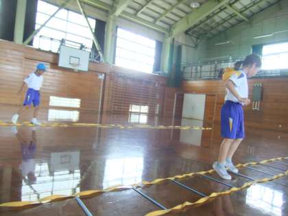 体育科では「チャレンジキッズわざ7」に取り組んでいます。できる技を増やそうと進んで取り組んでいます。