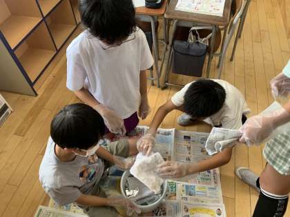 今日は、家庭科の学習で手洗い洗濯をしました。洗濯機で洗う前に手洗いをすることで、より多くの汚れがとれることを学んだ子供たちでした。