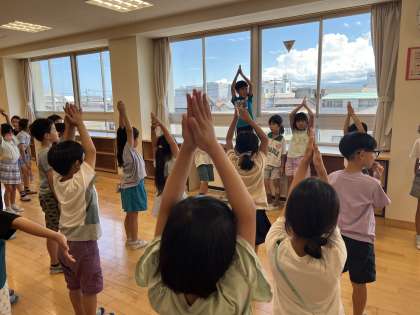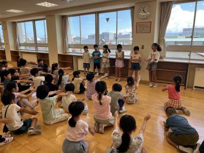 今日は1組主催の学年集会があり、「3時のおやつ」と「猛獣狩り」をしました。最後に夏休みに頑張りたいことを伝えました。