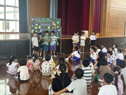 1学期最後の学年集会は、2組が企画した「ぐんぐんがんばろうしゅうかい」を行いました。
