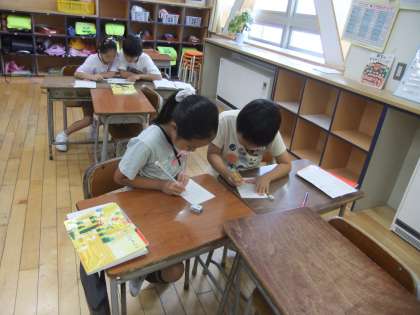国語科「書いたら、見直そう」の学習では、「ここに点があったら分かりやすいね」「話したことを書くときはお引っ越し(改行)をしないといけないよね」等と大切なポイントをペアで確認しました。