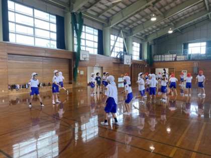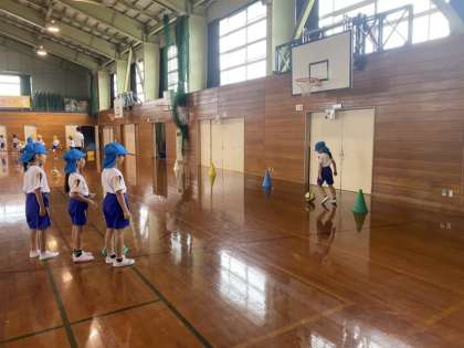今日は、4つの種目に分かれて体つくり運動をしました。声をかけ合いながら大縄をとんだり、コーンに向かってまっすぐにボールを蹴ったりしました。できるようになるまで何度も挑戦する子供たちの姿が見られました。