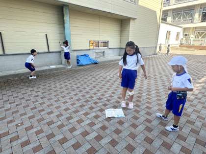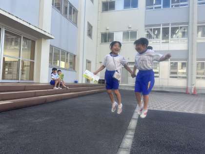 国語科の「くじらぐも」の学習では、気持ちのよい青空の下で、お話に出てくる「1ねん2くみの子どもたち」になりきって音読したり、場面の様子を想像したりしながら、お話の世界を楽しみました。