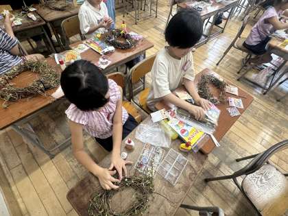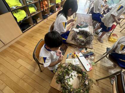 今日の生活科の学習では、子供たちが1学期から育てたアサガオのつるを使ってリースづくりを行いました。「毎日大切に育てたアサガオだから、リースも大切にしたいな」「毎日お水やりをしたから、大きなリースになったよ」等、学習を振り返っていました。