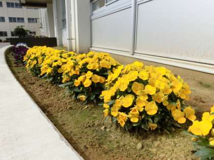 学校では、昨年の冬に植えたパンジーがきれいな花を咲かせています。小さかった株が、長くて寒い冬を乗り越え、大きくなりました。
