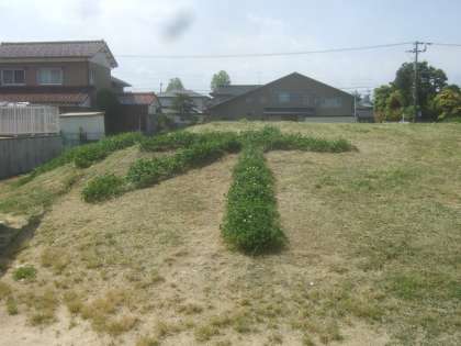 グラウンドの築山に、「オクダ」という文字が見られます。業務長が築山の草刈りを行った際に、シロツメクサを刈り残してデザインしました。