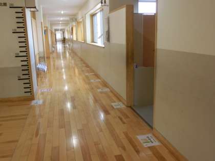 密になることが予想される場所(トイレ・洗面所・図書室等)には、都道府県や九九等をかいたカードを、1m以上離して貼ってあります。待っている間にも楽しく勉強できるようになっています。