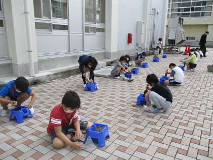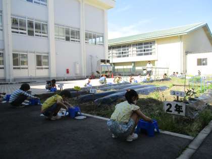 臨時休業期間中に、ご家庭にヘチマの種を持ち帰って植えていただきましたが、子供たちは学校でもみんなで新しいヘチマの種を植えました。