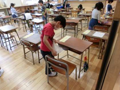 今、感染防止対策の一環として、子供たち自身が掃除をすることを控えています。自分で出したゴミは自分で始末しようと、持ってきたゴミ袋に丁寧に入れています。これまで以上に、学校を汚さないように心を配る奥田っ子たちに感心しています。
