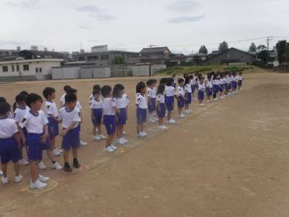 白ズックを履き、初めてグラウンドで体育の学習を行いました。先生のかけ声に合わせて動いたりかけっこをしたりするなど、体全体を使って運動しました。「久しぶりに体を動かすことができて楽しかった」と、汗を流しながらうれしそうに話してくれる子供たちでした。